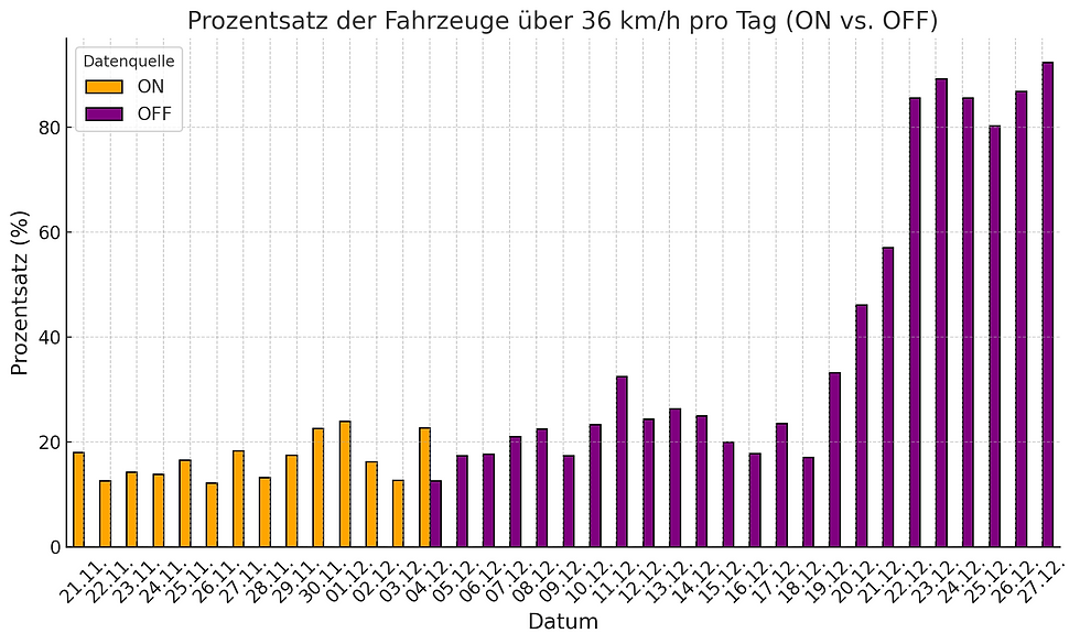 Solange die Ampel aktiv war, hielten sich mehr als 80 % der Verkehrsteilnehmer an die vorgegebene 30‑km/h‑Beschränkung. Am 04.12. wurde die Ampel in den inaktiven Zustand versetzt. Die physische Präsenz der Ampel führte augenscheinlich dazu, dass sich weiterhin die meisten Verkehrsteilnehmer an die vorgegebene Geschwindigkeit hielten. Erst mit der Entfernung der Ampel, um den ursprünglichen Zustand wiederherzustellen, stiegen sowohl die Durchschnittsgeschwindigkeit als auch der Anteil der Geschwindigkeitsübertretungen deutlich – auf über 80 %. Ohne Ampel halten sich also weniger als 20 % an das Geschwindigkeitslimit.