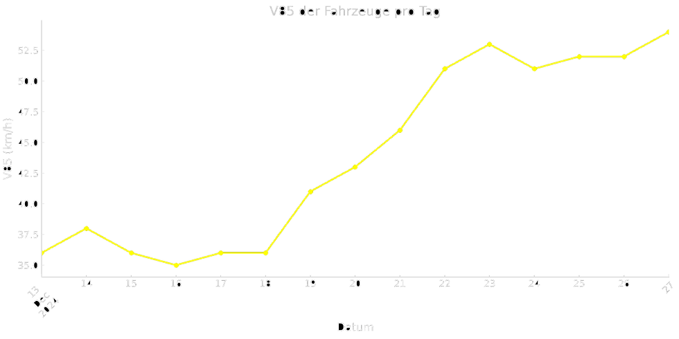 V85, oder das 85. Perzentil, ist die Geschwindigkeit, die von 85% der Fahrer nicht überschritten wird, oder die Geschwindigkeit, die von 15% der Fahrer überschritten wird. V85 gibt einen Einblick in die Verteilung der Geschwindigkeiten und die typischen Geschwindigkeiten, die über eine Messstelle ermittelt werden. Zum Beispiel bedeutet ein V85 von 45 km/h, dass 85% der Autos mit einer Geschwindigkeit fahren, die gleich oder niedriger als 45 km/h ist.